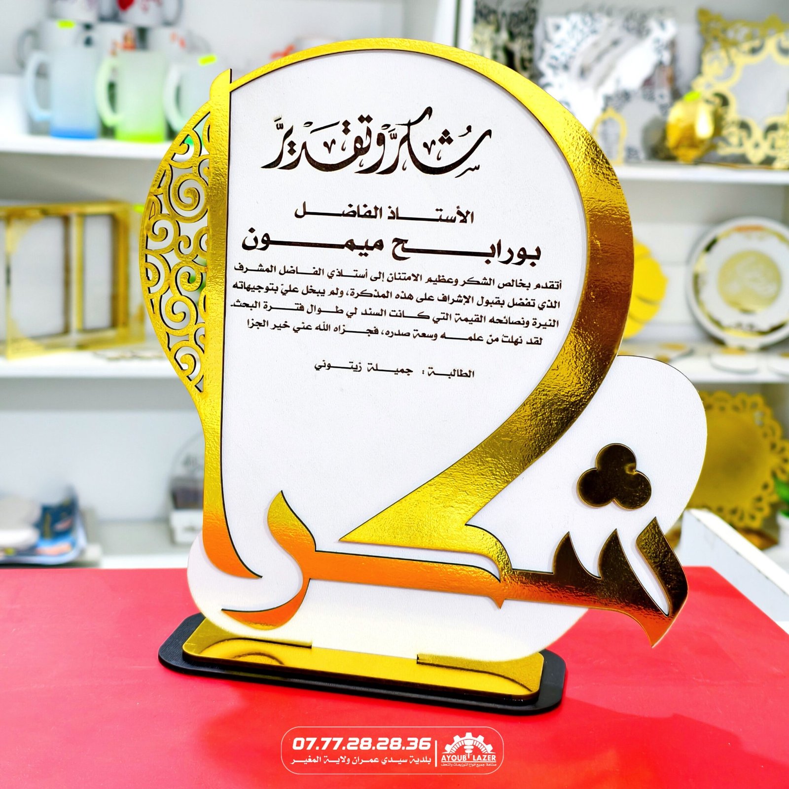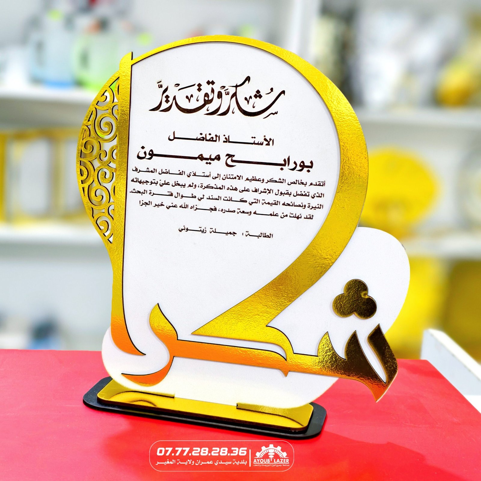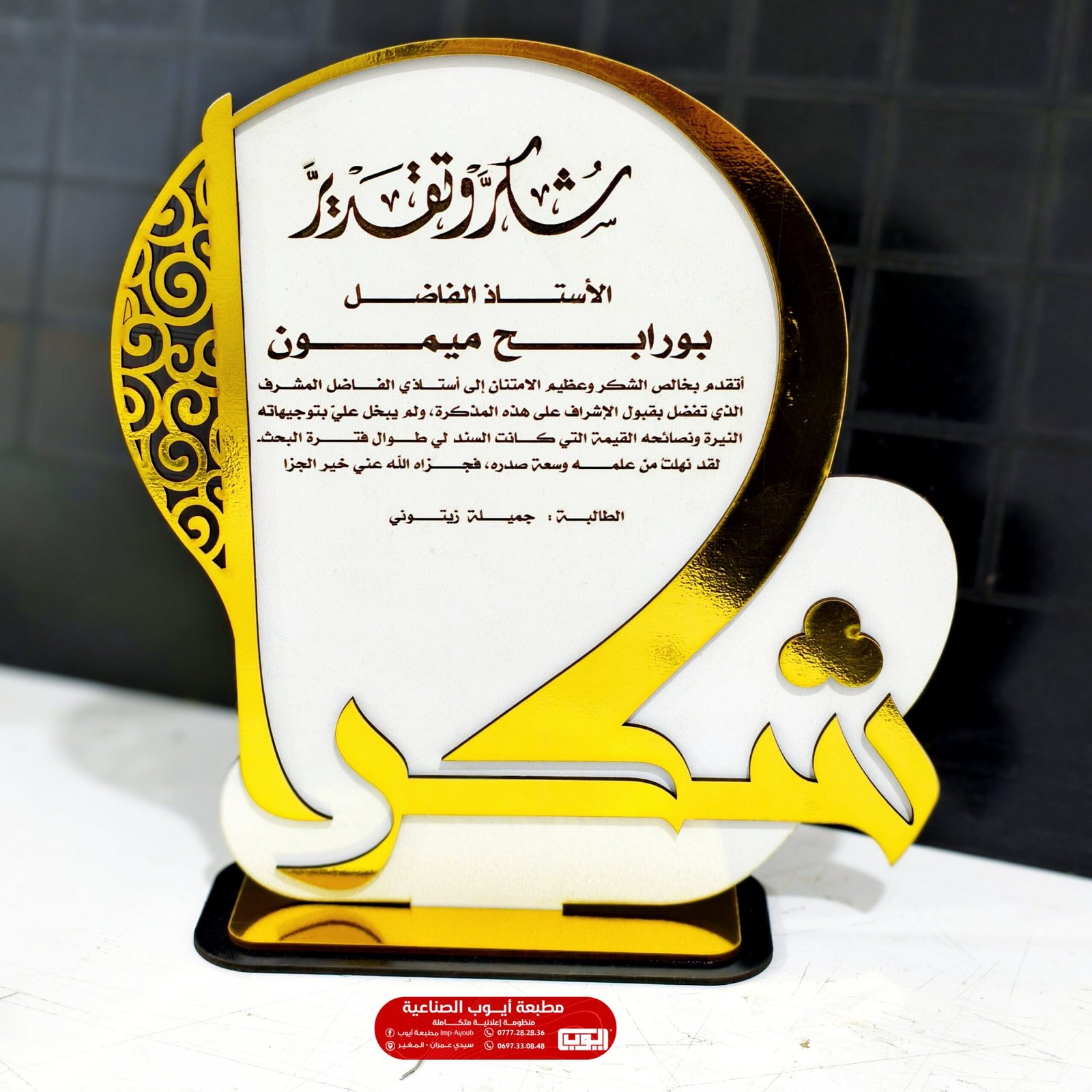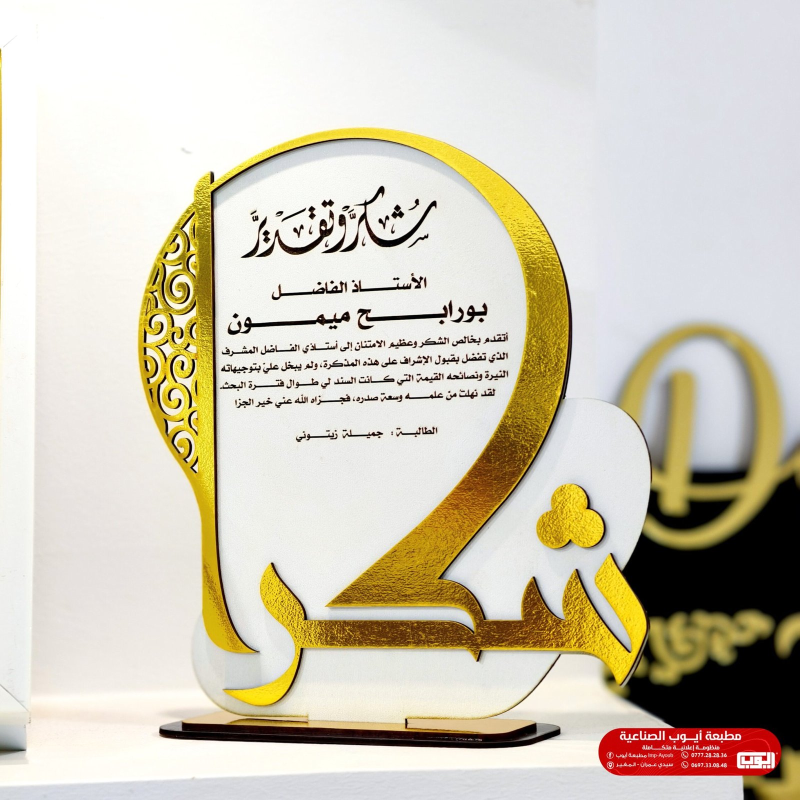لأن كلمات الامتنان تستحق أن تُخلد، نقدم لكم درع الشكر والتقدير بتصميم عصري يجمع بين فخامة اللون الذهبي ونقاء الأبيض. 🏆